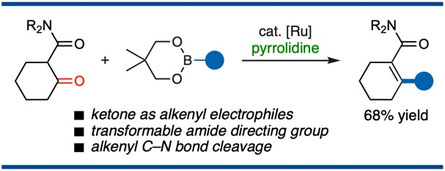 Ruthenium-Catalyzed Cross-Coupling of Ketones as an Alkenyl Electrophile with Organoborons via Cleavage of Alkenyl C–N Bonds of in Situ Generated Enamines